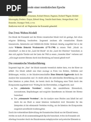 Jahrhunderts als reaktion auf die ideale der ordnung ruhe harmonie idealisierung und rationalität die den klassizismus prägten. Als reaktion auf den nüchternen stil des klassizismus der von den meisten akademien bevorzugt wurde schätzte die tiefgreifende internationale dynamik originalität inspiration und phantasie und förderte so eine vielzahl von stilen innerhalb der bewegung. Dazu gehören die weltweit berühmten komponisten franz schubert 1797 1828 robert schumann 1810 1856 richard wagner 1813 1883 giuseppe verdi 1813 1901 johannes brahms 1833 1893 hector berlioz 1803 1869 und nicht an letzter stelle richard strauss 1864 1939. Jahrhundert dirigent interpret komponist. Auch in der musik hat die romantik seine wichtige vertreter. Ralph vaughan williams die großen komponisten der romantik 1872 1958 20. Um die entwicklung der zunehmenden industrialisierung aufzuhalten betonten viele der romantiker zudem die verbundenheit des.